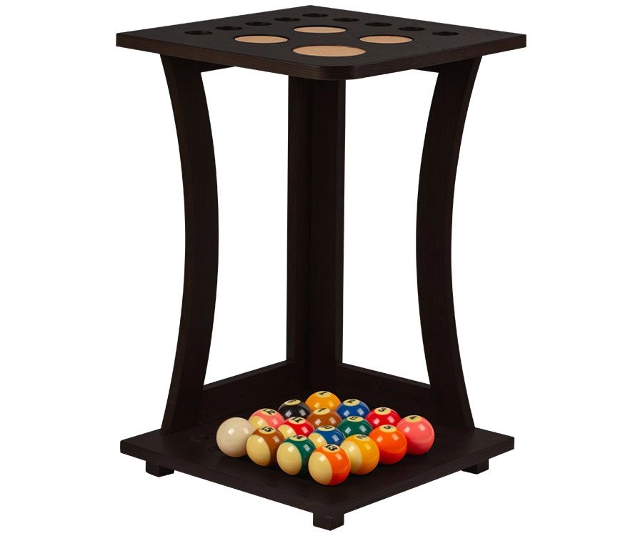 If you want to add a little something extra to your billiards room, floor racks are a great thing to consider. This beautiful corner floor stand securely holds 9 cues as the stand has a top shelf with holes to allow your cue to slide through and perfect bumper indentations on the bottom shelf for bumper to nuzzle right into. This FRD9 also comes in several stain options such as chocolate, honey, midnight and wine.