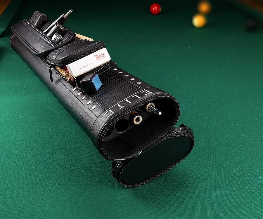 This black leather case carries two butts and four shafts up to 30-inches in length, offering great protection for your cues. Two spacious pockets, carrying handles and a shoulder strap add value to this reasonably priced case.