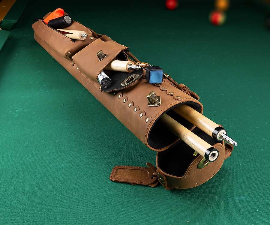 This is the utmost in cue stick protection. The outside of this bag is leather with detail riveting on the front and the back. There are handles at the top and the side, and an adjustable shoulder strap to give you ease of carry. The three pockets on the outside of this case are designed to fit all your pool accessories, including a special pocket for your jump cue butt. This case has all its angles covered.