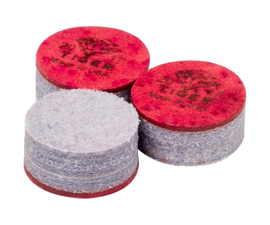 Soft Tiger tips are made out of white cow hide and give all the benefits of a soft tip without mushrooming. Medium and hard Tiger tips have a dark brown color and are made with two different types of treated pig skins. By using the natural character of the leather, better consistency and maximum control on the specific hardness is achieved. Each hardness is then checked with a Durometer tester for its range.